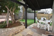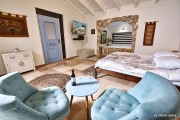 בחצר המתחם בריכה עגולה מוקפת אבן, ערסלים, פינת ישיבה, ספסלים