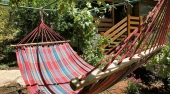 | סוכך נגד שמש, רהיטי גן מרהיבים - בחצר, עצים עוטפים את המתחם, מגוון פרחים צבעוניים, ישנם ערסלים, ספסלים לישיבה בחצר, פינה יפה לשבת בה.